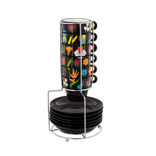 PYL-37388 JAR – CAFE COLORE set 6 porculanskih šalica 100 ml na stalku, Jardin fleuri